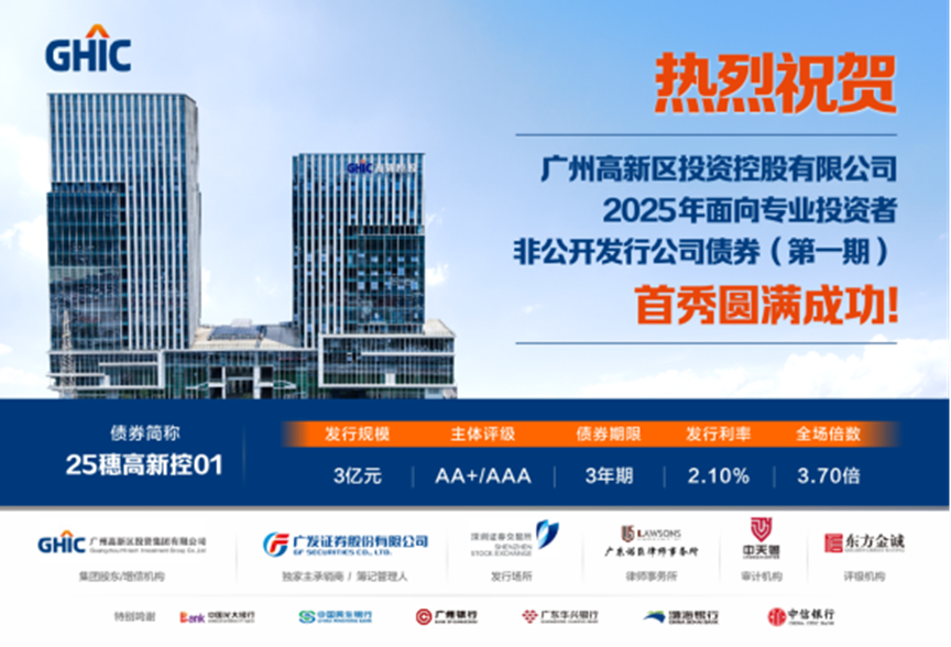 繼取得AA+主體信用評級后,廣州高新區(qū)投資控股有限公司(以下簡稱“高新控股公司”)于2025年9月17日成功獲批15億私募公司債券,審核周期僅71天,并于2025年10月20日面向?qū)I(yè)投資者非公開發(fā)行公司債券(第一期)成功完成簿記發(fā)行。首期債券發(fā)行規(guī)模3億元,期限3年,票面利率低至2.10%,全場認(rèn)購倍數(shù)達(dá)3.7倍,較1年期LPR下浮90BP!簿記當(dāng)日市場反映熱烈,參與機(jī)構(gòu)類型多元,涵蓋保險(xiǎn)、銀行、證券、信托等,累計(jì)認(rèn)購資金超10億元。