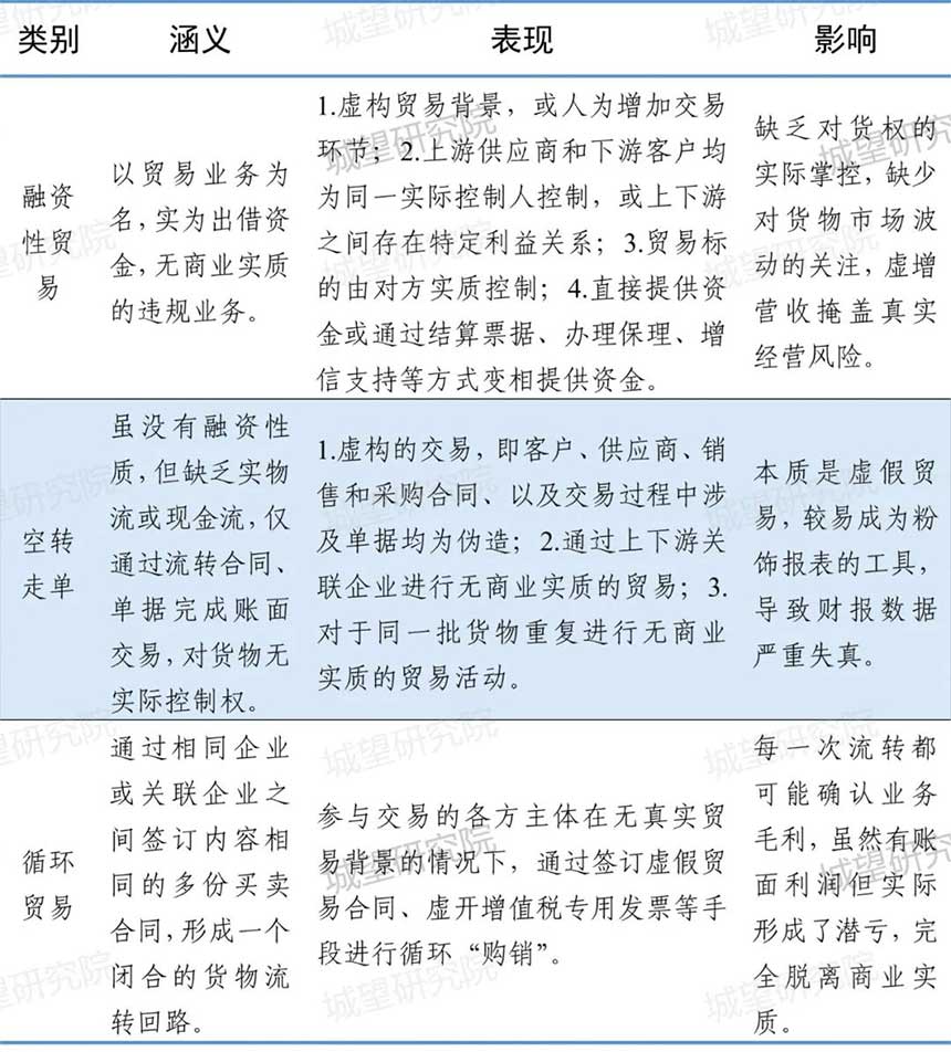 這一新增要求旨在精準甄別相關(guān)主體貿(mào)易業(yè)務(wù)的真實性與商業(yè)合理性,有效遏制利用貿(mào)易業(yè)務(wù)虛增營收、粉飾財務(wù)報表等刻意造假行為。(二)開展貿(mào)易業(yè)務(wù)“十不準”2023年10月,國務(wù)院國資委正式發(fā)布《關(guān)于規(guī)范中央企業(yè)貿(mào)易管理嚴禁各類虛假貿(mào)易的通知》(國資發(fā)財評規(guī)〔2023〕74號,以下簡稱“74號文”),明確提出“十不準”監(jiān)管要求,系統(tǒng)梳理融資性貿(mào)易、空轉(zhuǎn)走單、循環(huán)貿(mào)易(表1)等10類典型違規(guī)行為。表1:融資性貿(mào)易、空轉(zhuǎn)走單、循環(huán)貿(mào)易涵義、表現(xiàn)及影響(三)嚴格按照收入準則的相關(guān)規(guī)定進行判斷和會計處理2023年12月,財政部發(fā)布《關(guān)于嚴格執(zhí)行企業(yè)會計準則切實做好企業(yè)2023年年報工作的通知》(財會〔2023〕29號),重點強化收入確認中主要責(zé)任人和代理人的認定標準,明確要求貿(mào)易、百貨、電商等行業(yè)需結(jié)合商業(yè)模式,嚴格按收入準則規(guī)范會計處理。這一規(guī)定與“74號文”中的“不準違反會計準則規(guī)定確認代理貿(mào)易收入”形成政策合力,明確要求通過控制權(quán)轉(zhuǎn)移、風(fēng)險承擔(dān)等要素判斷業(yè)務(wù)實質(zhì),杜絕以全額法虛增收入的違規(guī)操作,推動貿(mào)易業(yè)務(wù)收入確認回歸商業(yè)實質(zhì)。04