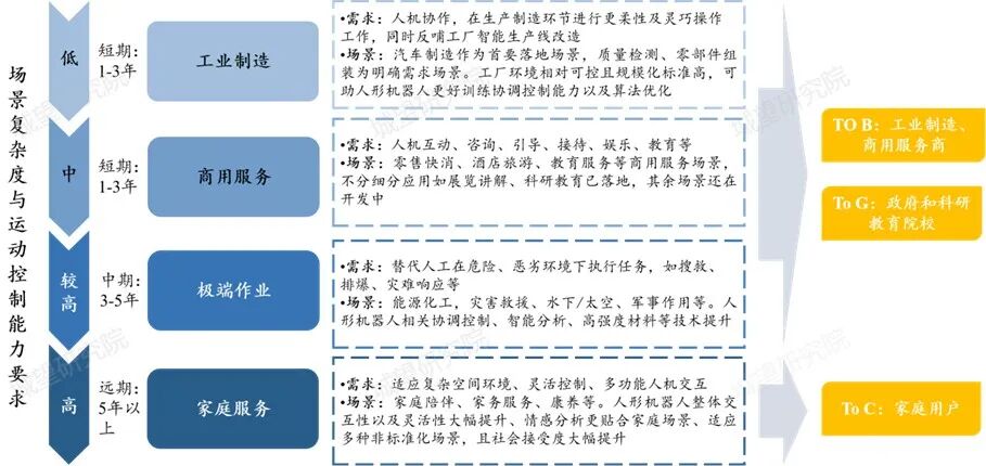 家庭服務被視為人形機器人應用的遠期目標,場景涉及非標準化生活環(huán)境,對人形機器人高隨機性、復雜性場景運動控制要求較高。預計隨著在工業(yè)與商業(yè)場景中持續(xù)積累數(shù)據(jù)并優(yōu)化系統(tǒng),人形機器人將逐步實現(xiàn)能力迭代,最終進入家庭應用領域,開拓面向消費者的市場。