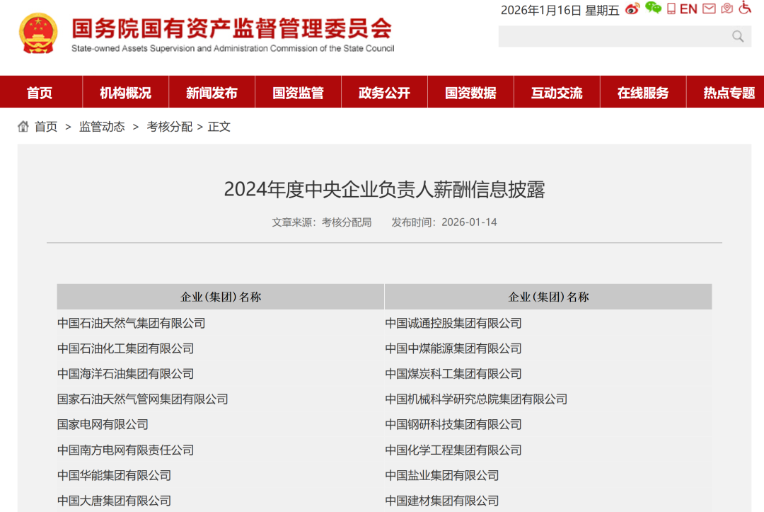 2026年1月14日,國(guó)務(wù)院國(guó)資委網(wǎng)站發(fā)布2024年度中央企業(yè)負(fù)責(zé)人薪酬披露。80余家央企分別在企業(yè)官網(wǎng)公布了負(fù)責(zé)人年薪收入情況。