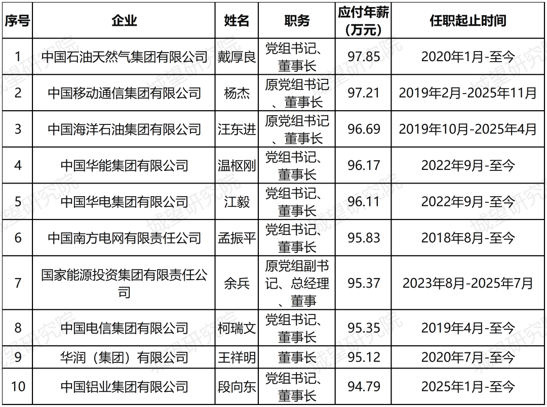 中央企業(yè)一把手的年薪能達(dá)到多少?城望研究院為大家梳理總結(jié)了央企一把手2024年應(yīng)付年薪。