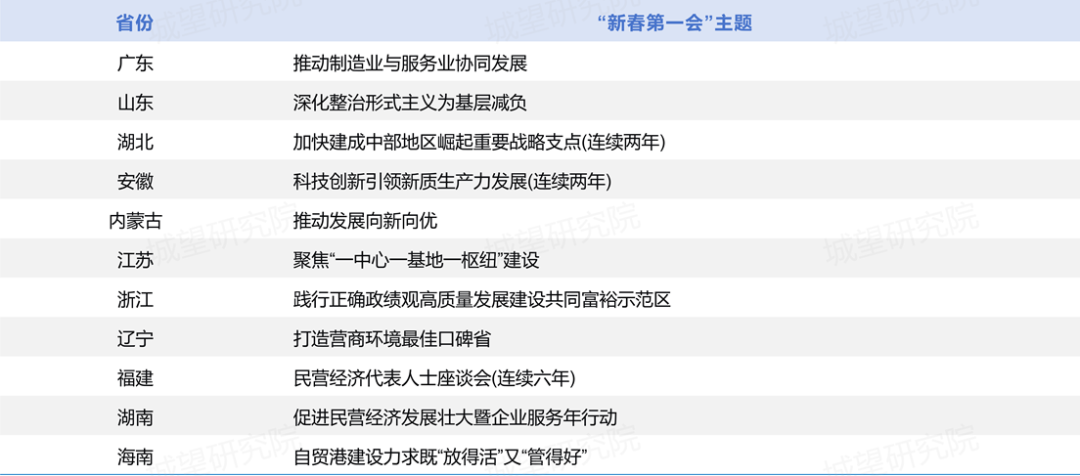 日前,中共中央辦公廳印發(fā)《關(guān)于在全黨開展樹立和踐行正確政績觀學(xué)習(xí)教育的通知》,通知指出,在全黨開展樹立和踐行正確政績觀學(xué)習(xí)教育,教育引導(dǎo)各級黨組織和黨員、干部堅持實(shí)事求是、求真務(wù)實(shí),為人民出政績、以實(shí)干出政績。浙江以“圍繞牢固樹立和踐行正確政績觀,深入踐行‘八八戰(zhàn)略’,高質(zhì)量發(fā)展建設(shè)共同富裕示范區(qū)”為題,召開新春第一會,強(qiáng)調(diào)要牢固樹立和踐行正確政績觀。江蘇明確,要樹立和踐行正確政績觀,堅持從實(shí)際出發(fā)、按規(guī)律辦事,一個問題一個問題攻堅,一件事情一件事情抓實(shí),一步一個腳印往前推進(jìn),不斷積小勝為大勝。福建提出,全省各級各部門要牢固樹立和踐行正確政績觀,構(gòu)建親清新型政商關(guān)系,進(jìn)一步增強(qiáng)服務(wù)意識、提升服務(wù)效能、改進(jìn)服務(wù)作風(fēng)。廣西提出,樹立和踐行正確政績觀,進(jìn)一步樹牢“實(shí)干為要、創(chuàng)新為魂,用業(yè)績說話、讓人民評價”的鮮明導(dǎo)向。區(qū)域競爭不進(jìn)則退,慢進(jìn)亦退。站在“十五五”開局,各地也都在強(qiáng)化創(chuàng)新驅(qū)動,搶占新的產(chǎn)業(yè)風(fēng)口,全力重塑區(qū)域競爭新優(yōu)勢。廣東要發(fā)展壯大新興產(chǎn)業(yè)、未來產(chǎn)業(yè),“群鏈一體化”打造產(chǎn)業(yè)新支柱,培育更多萬億元級、千億元級產(chǎn)業(yè)集群。安徽“新春第一會”再次鎖定科技創(chuàng)新引領(lǐng)新質(zhì)生產(chǎn)力發(fā)展,加快推動產(chǎn)業(yè)結(jié)構(gòu)升級。當(dāng)未來產(chǎn)業(yè)培育壯大工程進(jìn)入實(shí)施階段,安徽的量子科技、生物制造、氫能和核聚變能、腦機(jī)接口、具身智能、第六代移動通信、前沿材料等將成為新的經(jīng)濟(jì)增長點(diǎn),科技創(chuàng)新資源將越來越多地轉(zhuǎn)化為顯性的生產(chǎn)力。湖北干脆將4款“湖北造”eVTOL(電動垂直起降飛行器)搬進(jìn)“新春第一會”現(xiàn)場,既打開全省低空經(jīng)濟(jì)發(fā)展的想象空間,也展現(xiàn)出其推動低空經(jīng)濟(jì)、人工智能等新興產(chǎn)業(yè)規(guī)?;S升的決心。3.民營經(jīng)濟(jì)是高質(zhì)量發(fā)展的重要力量民營經(jīng)濟(jì)是推進(jìn)中國式現(xiàn)代化的生力軍,是高質(zhì)量發(fā)展的重要基礎(chǔ),是推動我國全面建成社會主義現(xiàn)代化強(qiáng)國的重要力量。今年“新春第一會”中,湖南、福建將民營經(jīng)濟(jì)發(fā)展擺在突出位置,以實(shí)打?qū)嵉呐e措為民營經(jīng)濟(jì)發(fā)展撐腰鼓勁,彰顯出持續(xù)激發(fā)民營經(jīng)濟(jì)活力與創(chuàng)造力的堅定決心。例如,福建連續(xù)第六年以“新春第一會”形式,同來自各行各業(yè)的民營企業(yè)負(fù)責(zé)人面對面共商發(fā)展、共話未來。會議要求,福建全省各級各部門要牢固樹立和踐行正確政績觀,構(gòu)建親清新型政商關(guān)系,進(jìn)一步增強(qiáng)服務(wù)意識、提升服務(wù)效能、改進(jìn)服務(wù)作風(fēng),當(dāng)好“陪跑員”“勤務(wù)員”“護(hù)航員”,為企業(yè)撐傘遮雨、修路架橋、加油鼓勁,全力支持大家跑出加速度、跑出好成績,真正讓廣大民營企業(yè)和民營企業(yè)家更加有感有得。4.科技是第一生產(chǎn)力、創(chuàng)新是第一動力在各地“新春第一會”上,科技創(chuàng)新成為高頻詞,安徽、湖北、廣東等地將科技創(chuàng)新擺在發(fā)展的突出位置,以科技創(chuàng)新引領(lǐng)新質(zhì)生產(chǎn)力發(fā)展,為產(chǎn)業(yè)升級、動能轉(zhuǎn)換提供核心支撐。例如,2月24日,2026年湖北“新春第一會”——全省加快建成中部地區(qū)崛起的重要戰(zhàn)略支點(diǎn)推進(jìn)大會提出,更加深入實(shí)施“七大戰(zhàn)略”,其中第一條就是強(qiáng)化創(chuàng)新引領(lǐng),在構(gòu)建現(xiàn)代化產(chǎn)業(yè)體系上實(shí)現(xiàn)新突破。1.廣東:推動制造業(yè)與服務(wù)業(yè)協(xié)同發(fā)展2月24日,中國經(jīng)濟(jì)第一大省廣東連續(xù)四年在開工首日召開全省高質(zhì)量發(fā)展大會,主題為“制造業(yè)與服務(wù)業(yè)協(xié)同發(fā)展”,向全社會傳遞出廣東推進(jìn)產(chǎn)業(yè)轉(zhuǎn)型升級、鞏固提升發(fā)展優(yōu)勢的堅定決心。值得注意的是,2026年這一主題承前啟后,既與前三屆大會主題——“再造一個新廣東”“產(chǎn)業(yè)科技互促雙強(qiáng)”“建設(shè)現(xiàn)代化產(chǎn)業(yè)體系”一脈相承、一以貫之,更充分彰顯了廣東一張藍(lán)圖繪到底,扎實(shí)推動高質(zhì)量發(fā)展的戰(zhàn)略定力。廣東省委主要領(lǐng)導(dǎo)在會上表示,制造業(yè)與服務(wù)業(yè)雙向奔赴,關(guān)乎廣東高質(zhì)量發(fā)展大局、現(xiàn)代化建設(shè)全局。要以制造業(yè)之強(qiáng)牽引服務(wù)業(yè)之優(yōu),以服務(wù)業(yè)之優(yōu)增進(jìn)制造業(yè)之強(qiáng),在“制造強(qiáng)省”與“服務(wù)高地”相互成就中打開產(chǎn)業(yè)發(fā)展新天地,讓現(xiàn)代化產(chǎn)業(yè)體系這棵大樹在廣東的發(fā)展沃土上深深扎根、茁壯成長。未來10年,將建成一個實(shí)力雄厚的廣東。經(jīng)濟(jì)總量相比2022年實(shí)現(xiàn)倍增、達(dá)25.8萬億元左右;人均