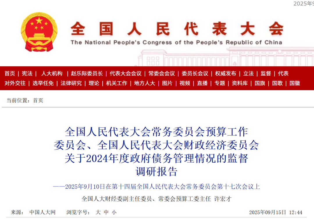 全國人民代表大會常務(wù)委員會: 按照全國人大常委會2025年度監(jiān)督工作計(jì)劃,預(yù)算工作委員會、財(cái)政經(jīng)濟(jì)委員會認(rèn)真學(xué)習(xí)貫徹習(xí)近平新時(shí)代中國特色社會主義思想,召開座談會聽取國務(wù)院有關(guān)部門關(guān)于政府債務(wù)管理情況的介紹,到財(cái)政部、中國人民銀行、金融監(jiān)管總局、中國證監(jiān)會、國家開發(fā)銀行等部門單位和江蘇、浙江、湖北、廣西、四川等?。▍^(qū))開展調(diào)研,并委托天津、安徽、河南、貴州、云南、陜西等?。ㄊ校┤舜蟪N瘯A(yù)算工委協(xié)同開展調(diào)研,廣泛聽取各方面情況介紹和意見建議。在上述工作基礎(chǔ)上形成了監(jiān)督調(diào)研報(bào)告。全國人大常委會副委員長肖捷、張慶偉指導(dǎo)和參加有關(guān)調(diào)研活動(dòng),全國人大財(cái)經(jīng)委側(cè)重預(yù)算審查監(jiān)督工作的部分組成人員、部分全國人大預(yù)算審查聯(lián)系代表參加有關(guān)調(diào)研活動(dòng)?,F(xiàn)將主要情況報(bào)告如下: 01 政府債務(wù)管理、監(jiān)督和風(fēng)險(xiǎn)防范化解 取得積極成效 2024年以來,貫徹黨中央決策部署,落實(shí)全國人大及其常委會有關(guān)決議和審議意見要求,國務(wù)院及其財(cái)政等部門堅(jiān)持統(tǒng)籌發(fā)展和安全,強(qiáng)化宏觀調(diào)控,及時(shí)出臺一系列增量政策舉措,不斷優(yōu)化政府債務(wù)管理,更好發(fā)揮政府債券功能,有力支持推動(dòng)高質(zhì)量發(fā)展,健全防范化解地方政府債務(wù)風(fēng)險(xiǎn)長效機(jī)制;各地加強(qiáng)組織領(lǐng)導(dǎo),用好中央支持政策,統(tǒng)籌調(diào)度資金資源,政府債務(wù)監(jiān)管和風(fēng)險(xiǎn)防范化解取得積極成效。 (一)著力加強(qiáng)政府債務(wù)使用管理 出臺超長期特別國債實(shí)施方案、項(xiàng)目管理和資金監(jiān)管辦法,采用“日常抽查+集中核查”方式,加強(qiáng)資金使用情況全過程監(jiān)督,“兩重”建設(shè)總體進(jìn)展順利,“兩新”政策實(shí)施成效明顯。優(yōu)化地方政府專項(xiàng)債管理機(jī)制,實(shí)施專項(xiàng)債投向領(lǐng)域“負(fù)面清單”管理,擴(kuò)大用作項(xiàng)目資本金的范圍,開展“自審自發(fā)”試點(diǎn),完善資金監(jiān)管和債務(wù)償還機(jī)制,推進(jìn)專項(xiàng)債形成資產(chǎn)管理工作,發(fā)揮政府投資撬動(dòng)作用,支持地方經(jīng)濟(jì)社會發(fā)展。 (二)積極穩(wěn)妥化解地方政府隱性債務(wù)風(fēng)險(xiǎn) 按照黨中央部署要求,2024年國務(wù)院報(bào)全國人大常委會批準(zhǔn)出臺增加6萬億元地方政府債務(wù)限額置換存量隱性債務(wù)等一系列增量化債政策,支持地方穩(wěn)妥化解隱性債務(wù)風(fēng)險(xiǎn)。截至2025年7月末,已累計(jì)發(fā)行置換債券3.9萬億元、實(shí)際使用3.6萬億元,有效減輕了地方還本付息壓力。強(qiáng)化紀(jì)檢監(jiān)察、財(cái)政、金融監(jiān)管等部門的貫通協(xié)同,嚴(yán)格執(zhí)行不新增隱性債務(wù)“鐵的紀(jì)律”,嚴(yán)格落實(shí)地方政府舉債終身問責(zé)制和債務(wù)問題倒查機(jī)制,保持“零容忍”高壓態(tài)勢。 (三)持續(xù)加強(qiáng)政府債務(wù)監(jiān)督 財(cái)政部門加強(qiáng)對涉及新增隱性債務(wù)、虛假化債等違法違規(guī)問題核查,推動(dòng)問責(zé)相關(guān)責(zé)任單位和責(zé)任人員。審計(jì)部門對超長期特別國債、增發(fā)國債資金及相關(guān)項(xiàng)目建設(shè)開展審計(jì),加大對隱性債務(wù)的審計(jì)力度,并依法依規(guī)推動(dòng)嚴(yán)肅問責(zé)。各級人大常委會加快建立健全政府債務(wù)管理情況報(bào)告制度,并在人大預(yù)算決算審查、預(yù)算執(zhí)行監(jiān)督、審計(jì)整改監(jiān)督等工作中,加強(qiáng)對政府債務(wù)的常態(tài)化監(jiān)督,及時(shí)提出意見建議,推動(dòng)完善制度、加強(qiáng)管理、改進(jìn)工作。 截至2024年末,全國政府債務(wù)余額92.6萬億元,其中:國債余額34.6萬億元、地方政府法定債務(wù)余額47.5萬億元,均控制在全國人大及其常委會批準(zhǔn)的限額內(nèi);地方政府隱性債務(wù)余額10.5萬億元,比2023年末減少3.8萬億元。全國政府負(fù)債率68.7%。 調(diào)研中,各方面反映,當(dāng)前政府債務(wù)管理和風(fēng)險(xiǎn)防范化解還存在一些困難和問題。 (一)政府債務(wù)管理有待加強(qiáng) 超長期特別國債管理有待完善,還本付息資金來源、償還責(zé)任有待進(jìn)一步明確。一些地方政府專項(xiàng)債存在償還壓力。政府債務(wù)資金形成資產(chǎn)管理仍需加強(qiáng)。市場化約束機(jī)制不夠健全。 (二)違規(guī)新增隱性債務(wù)和虛假化債時(shí)有發(fā)生 部分地方化債資金使用管理不嚴(yán),有的地方仍新增隱性債務(wù),或虛假化債、掩蓋地方真實(shí)債務(wù)水平。有些地方超出財(cái)政承受能力上項(xiàng)目,脫離預(yù)算約束搞建設(shè),尚存在新增隱性債務(wù)的隱患。 (三)政府債務(wù)規(guī)模和結(jié)構(gòu)有待優(yōu)化 近年來由于加大逆周期調(diào)節(jié)力度,加力實(shí)施積極的財(cái)政政策,疊加實(shí)施專項(xiàng)債置換地方政府存量隱性債務(wù)政策和土地出讓收入大幅下降,政府法定債務(wù)規(guī)模增長較