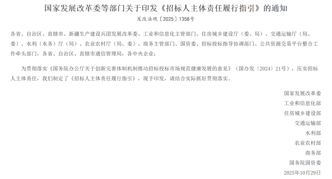 落實《政府工作報告》關(guān)于改革完善招標投標體制機制的部署要求,為引導(dǎo)和督促招標人落實主體責任,提高招標投標活動規(guī)范化科學化水平,近日,國家發(fā)展改革委、工業(yè)和信息化部、住房城鄉(xiāng)建設(shè)部、交通運輸部、水利部、農(nóng)業(yè)農(nóng)村部、商務(wù)部、國務(wù)院國資委等8部門聯(lián)合印發(fā)了《國家發(fā)展改革委等部門關(guān)于印發(fā)〈招標人主體責任履行指引〉的通知》(發(fā)改法規(guī)〔2025〕1358號,以下簡稱《指引》)。