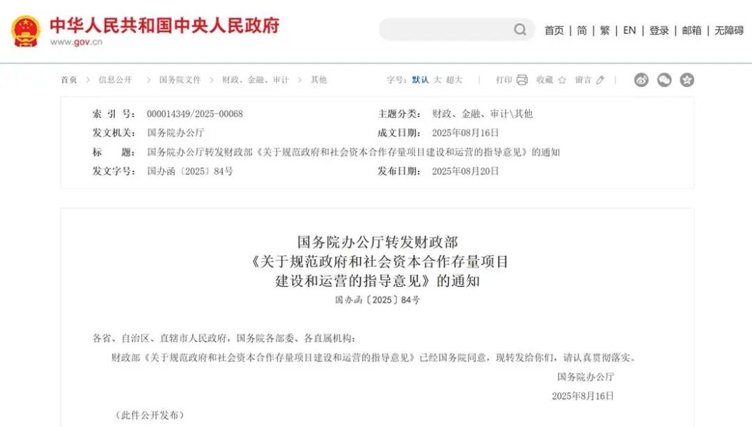 2025年8月20日,財政部發(fā)布《關于規(guī)范政府和社會資本合作存量項目建設和運營的指導意見》(國辦函〔2025〕84號)。